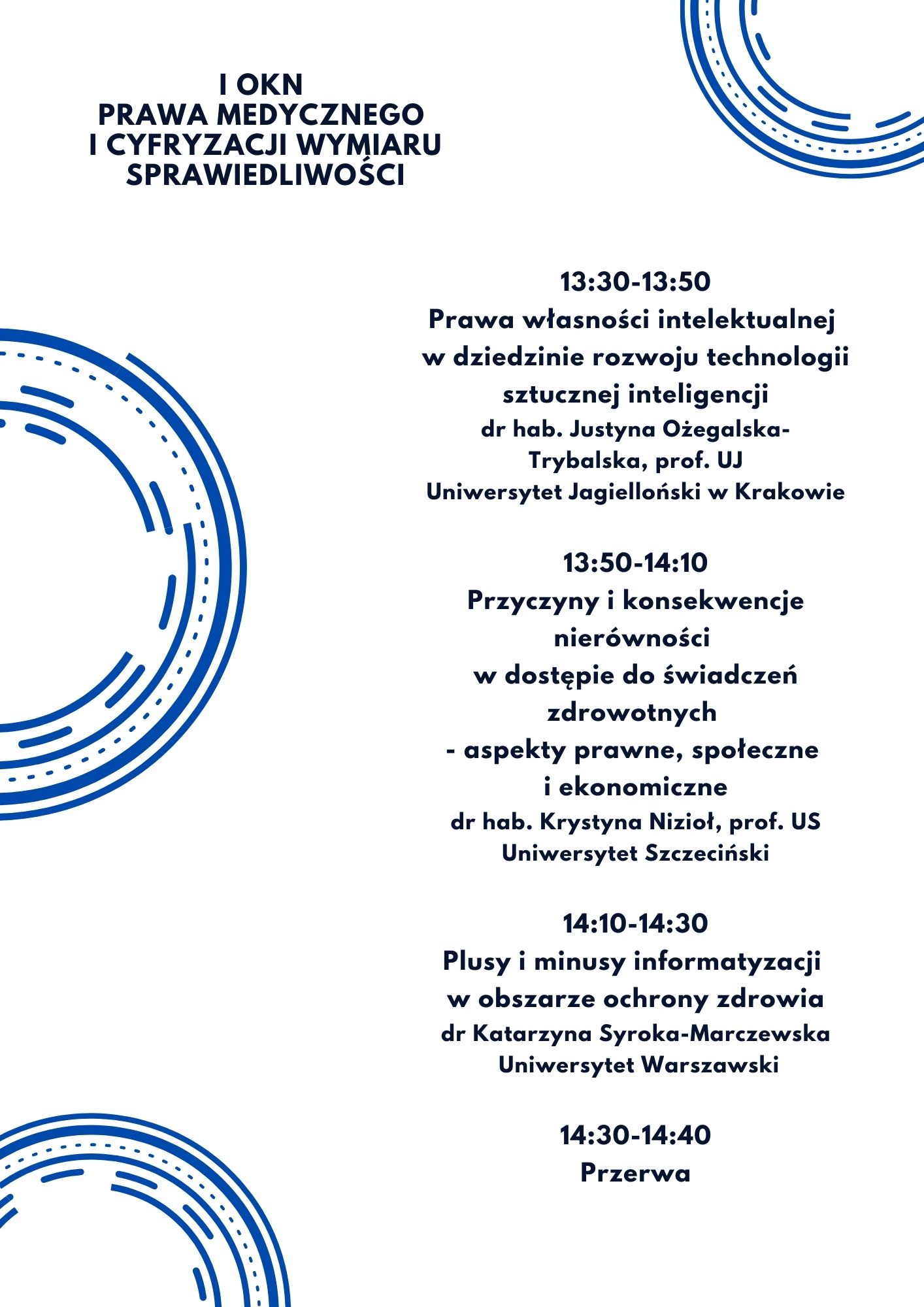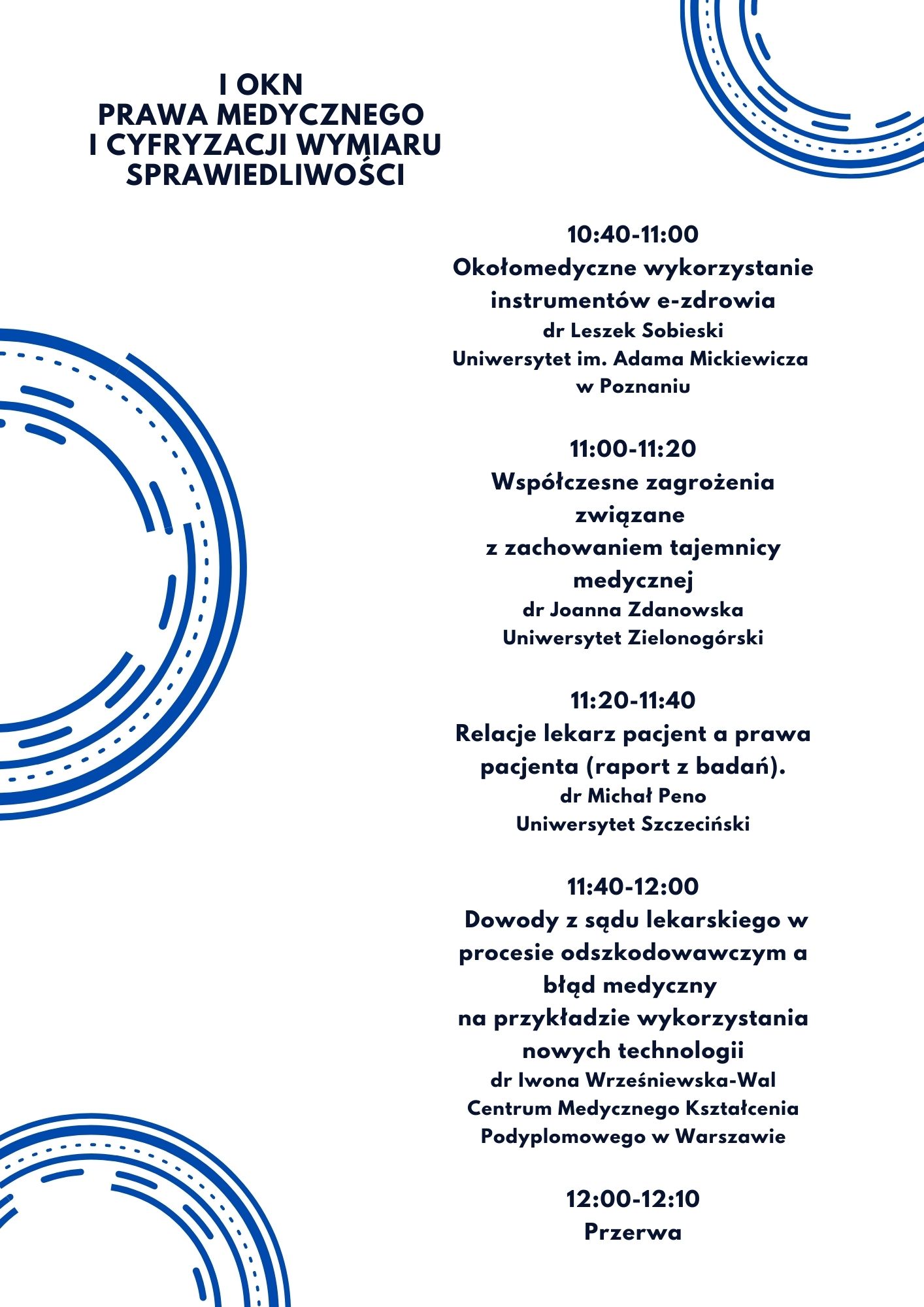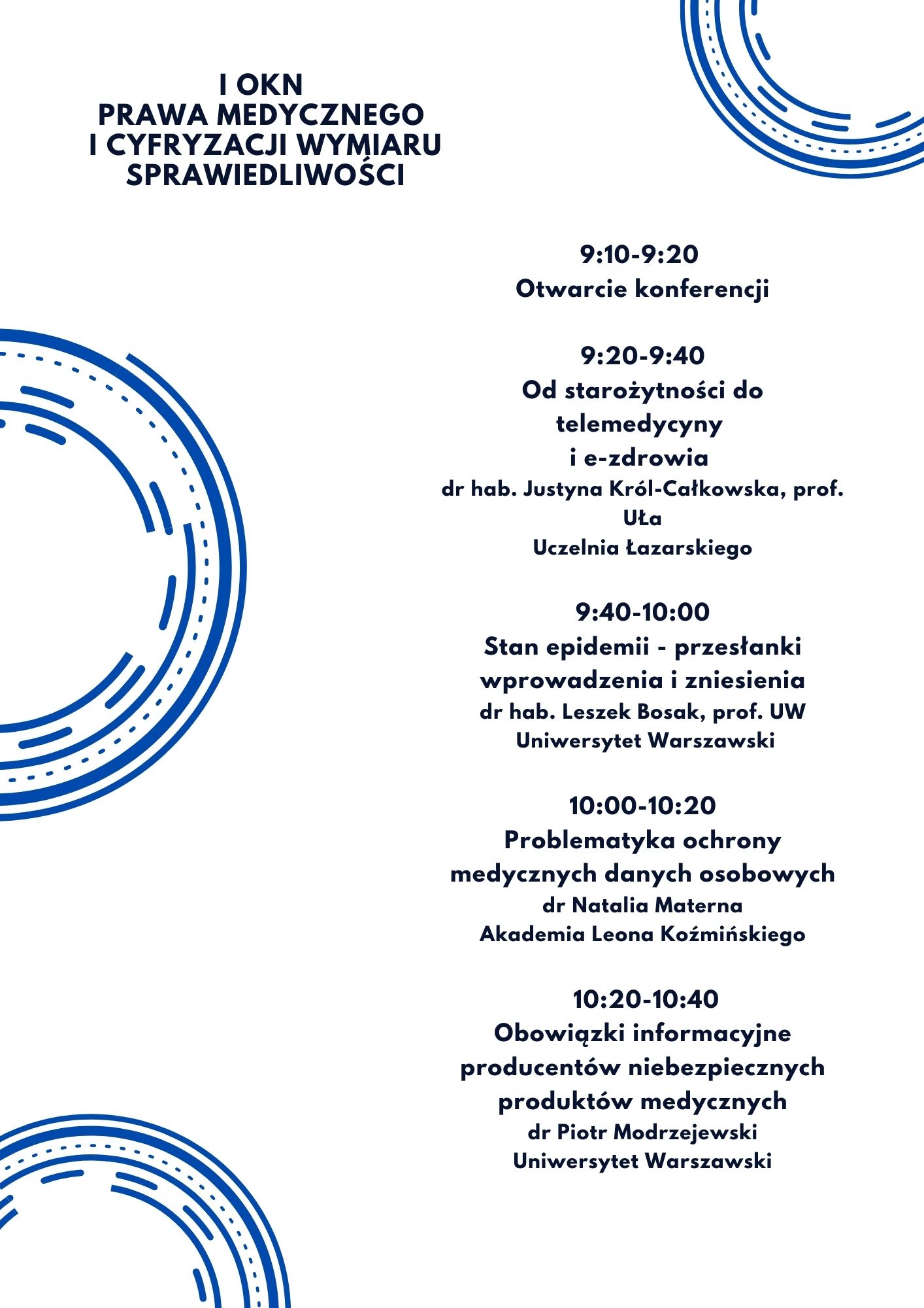 I OKN Prawa Medycznego i Cyfryzacji Wymiaru Sprawiedliwości to ogólnopolskie wydarzenie, które powstało z myślą o przedstawieniu aktualnych problemów i nowych wyzwań w obszarze prawa medycznego, zawodów medycznych, funkcjonowania systemu ochrony zdrowia, odpowiedzialności karnej, cywilnej, zawodowej oraz w obszarze cyfryzacji, digitalizacji wymiaru sprawiedliwości, wykorzystania nowych technologii w praktyce prawniczej.