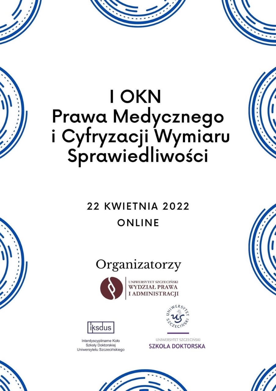 W dniu 22 kwietnia 2022 r. (piątek), w godz. 9:10-16:10) w formie online, odbędzie się I edycja Ogólnopolskiej Konferencji Naukowej Prawa Medycznego i Cyfryzacji Wymiaru Sprawiedliwości, organizowanej przez: