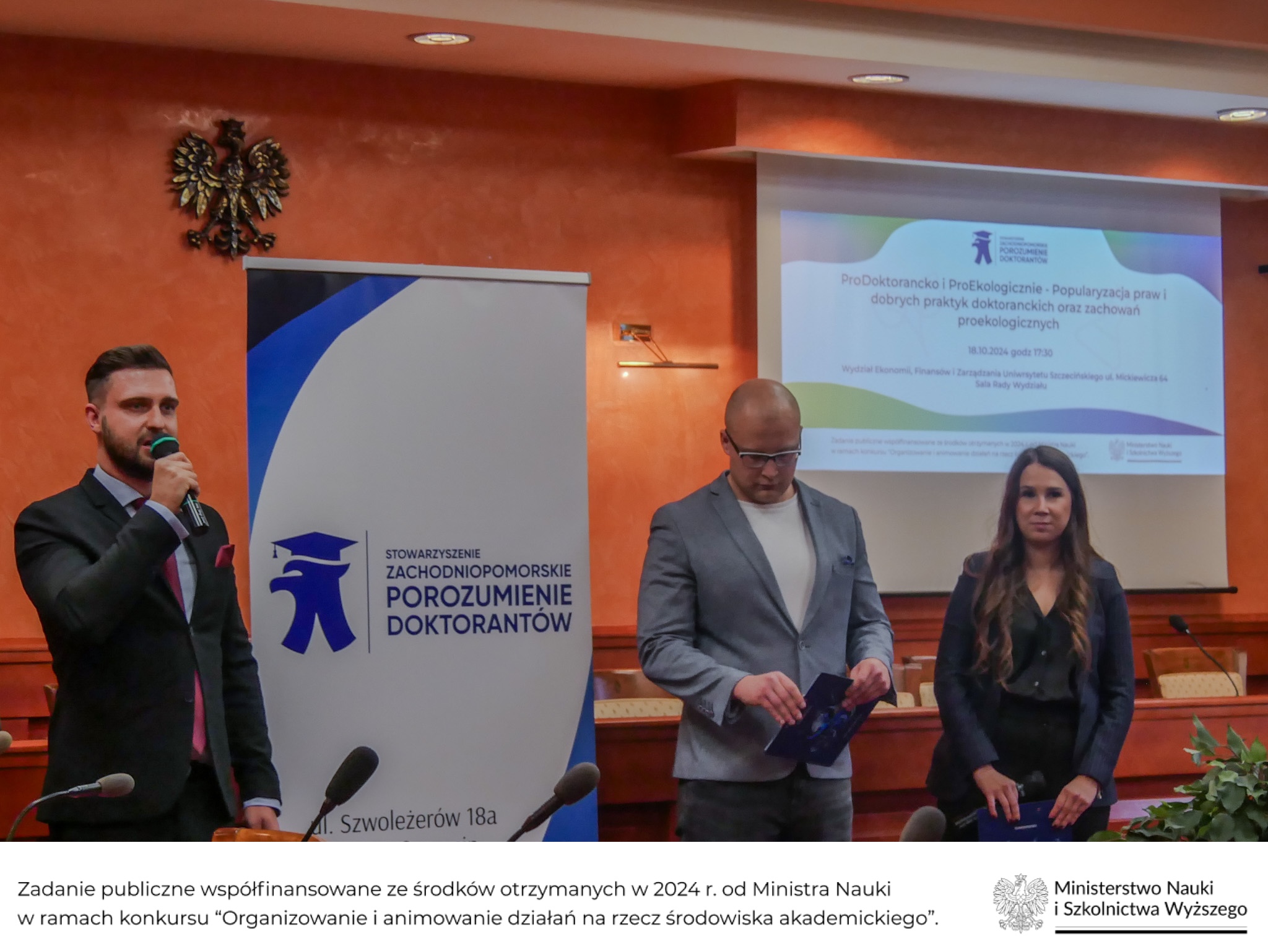 Informujemy, że w dniach 18-21 października w Szczecinie odbył się cykl szkoleń „Prodoktorancko i Proekologicznie” – Popularyzacja praw i dobrych praktyk doktoranckich oraz zachowań proekologicznych zorganizowany przez Stowarzyszenie Zachodniopomorskie Porozumienie Doktorantów. Realizacja szkoleń nie byłaby możliwa bez wsparcia Ministerstwa Nauki w ramach zadania publicznego współfinansowanego ze środków otrzymanych w 2024 r. od Ministra Nauki w ramach konkursu “Organizowanie i animowanie działań na rzecz środowiska akademickiego”. Na szkoleniach pojawiło się 38 doktorantów z 22 ośrodków naukowych w Polsce,co przerosło najśmielsze oczekiwania organizatorów.