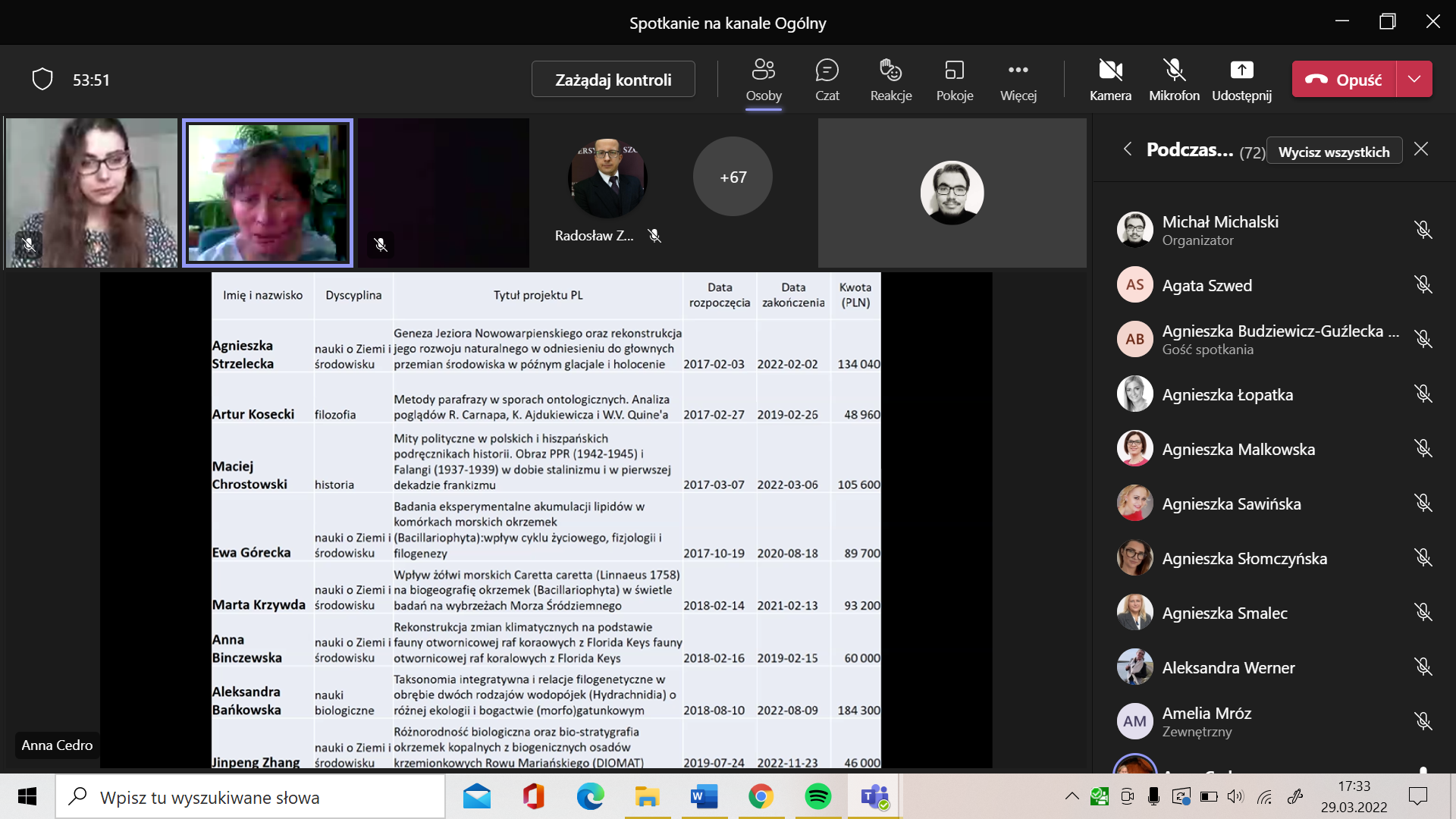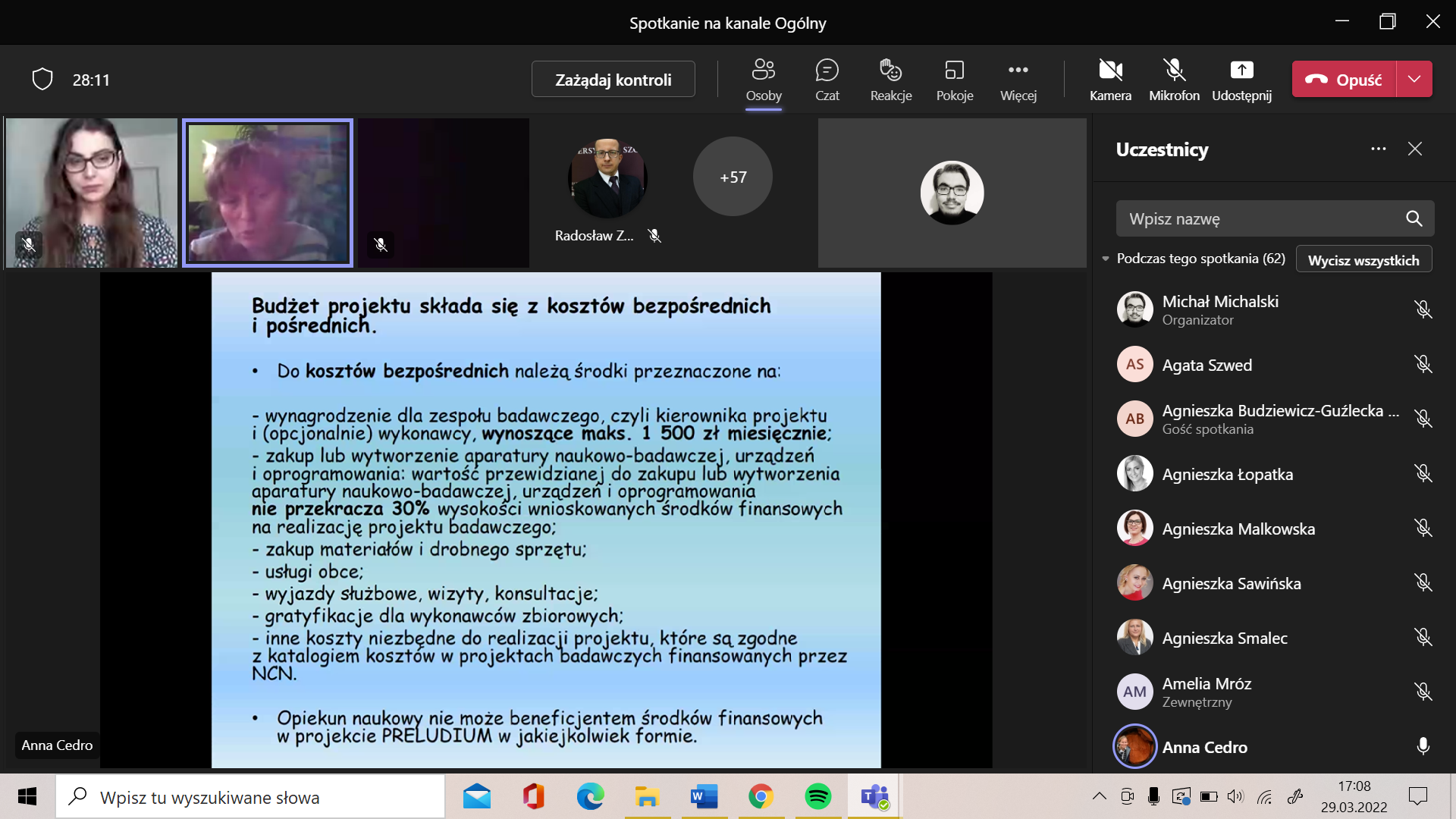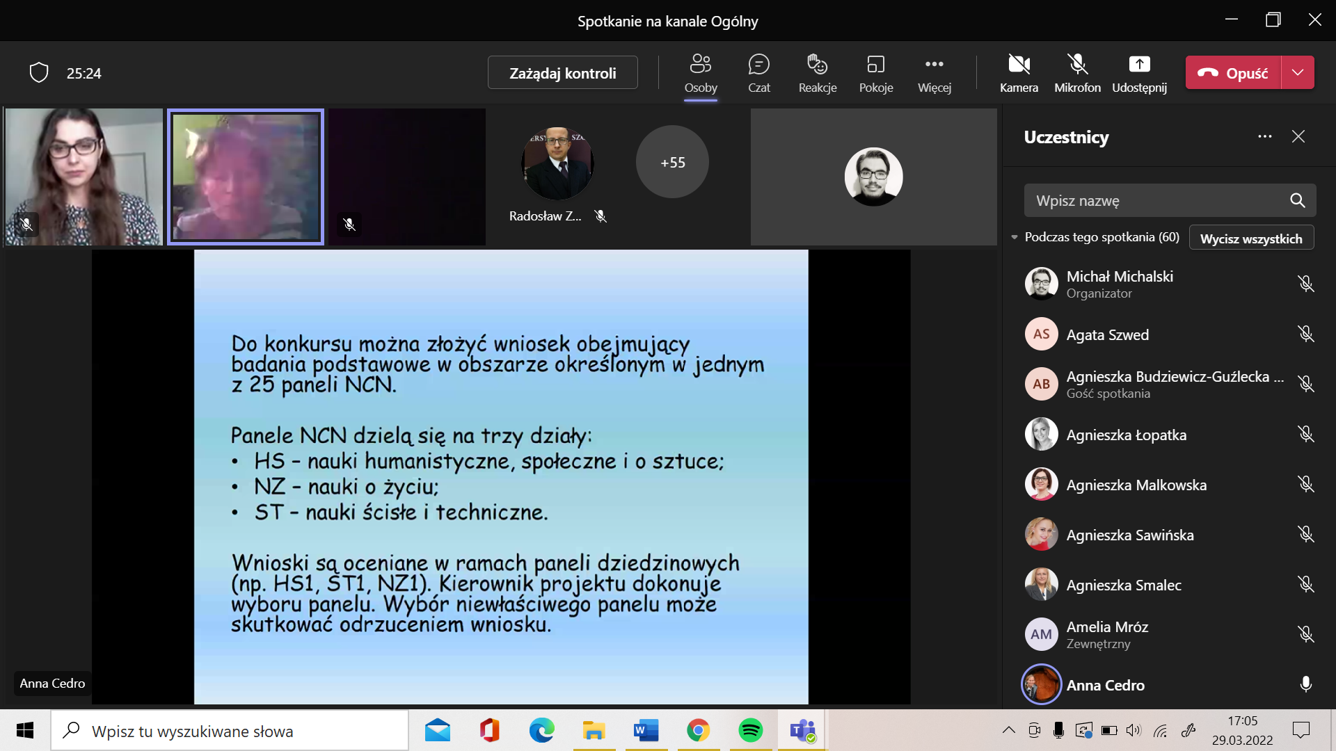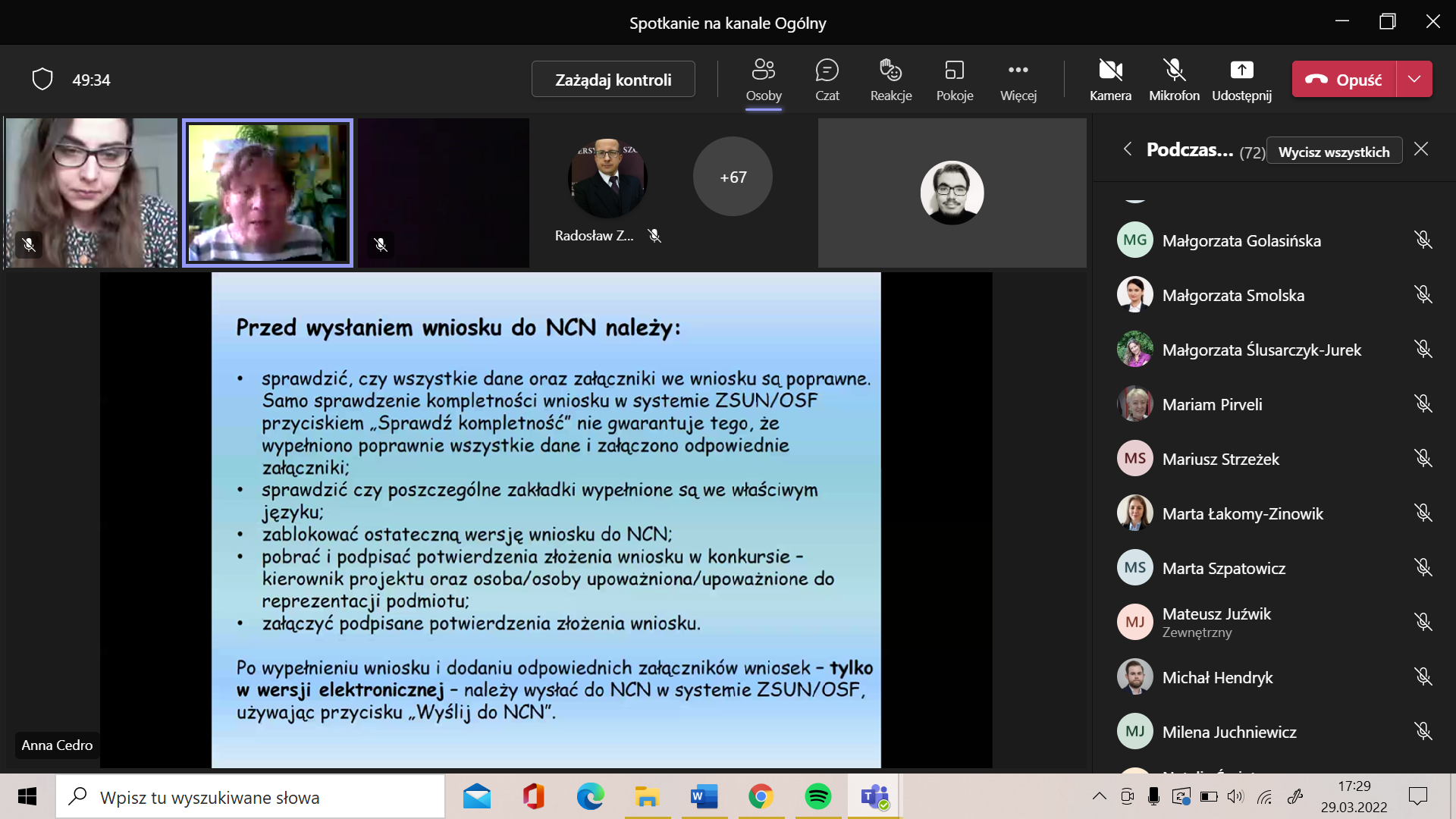 We wtorek 29.03.2022 roku na Platformie MS Teams odbył się wykład otwarty prof. dr hab. Anny Cedro na temat składania wniosków do programów Narodowego Centrum Nauki: Preludium oraz Miniatura. Spotkanie zorganizowała Szkoła Doktorska wraz z Interdyscyplinarnym Kołem Szkoły Doktorskiej Uniwersytetu Szczecińskiego. W wydarzeniu uczestniczyło w sumie 91 osób. Profesor Cedro przedstawiła najpierw program Preludium, który jest skierowany do osób nie posiadających stopnia doktora. Zaprezentowane i omówione zostały wszystkie elementy składowe wniosku. Pamiętajcie, że w tym roku składanie wniosków do programu Preludium zakończy się 15 czerwca 2022 roku. Planując zadania badawcze, Profesor zwróciła uwagę na to, aby je rozpisać w taki sposób, aby rozpoczynały się w roku 2023, ponieważ wyniki konkursu Preludium będą w grudniu 2022 roku.